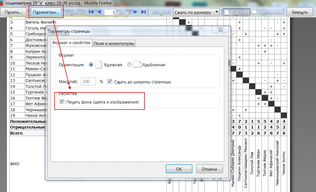 Обращаем внимание на галочку «фоновые цвета и изображения» и «верхние и нижние колонтитулы» (в данном случае принтер у вас должен быть Adobe PDF):