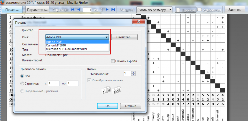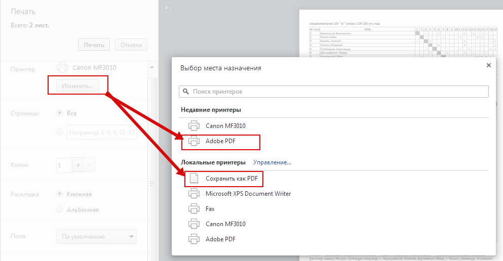 Там где принтер нажимаем кнопочку «изменить» и выбираем «Adobe PDF» или «Сохранить как PDF»