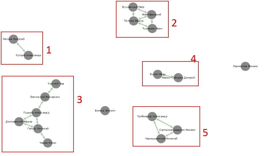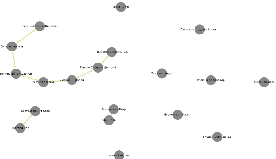 Для отслеживания "группировок" внутри исследуемой группы, а также взаимоотношений в них, мы реализовали дополнительный отчет - социограммы взаимных выборов.Рассмотрим все на том же примере с нашими писателями.